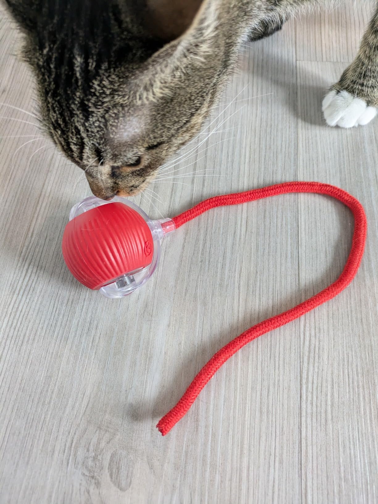 - Simply charge and hit the power button. Battery life is about 60 minutes on a full charge. The toy has a smart motion sensor that can automatically enter standby for a couple of minutes and then activates when your cat taps it. It turns off when play stops to save battery.